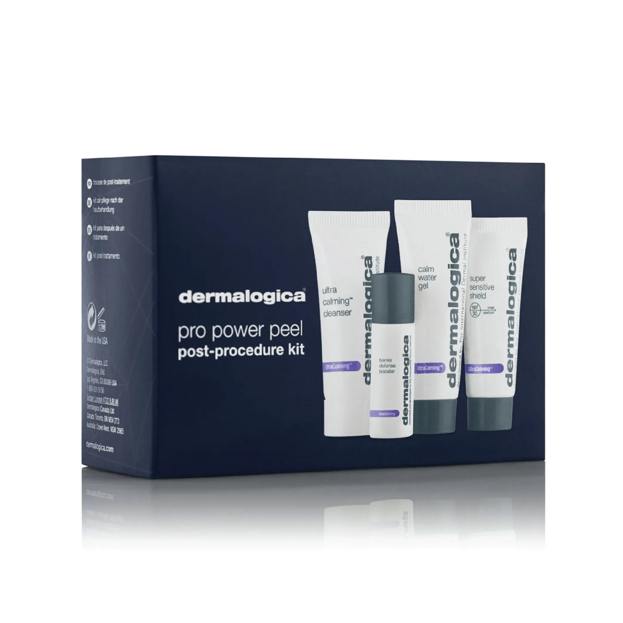 The Dermalogica PRO power peel post-procedure kit is designed to soothe skin following the pro power peeling. Includes 1 Each: ultra calming cleanser, barrier defense booster, calm water gel, super sensitive shield